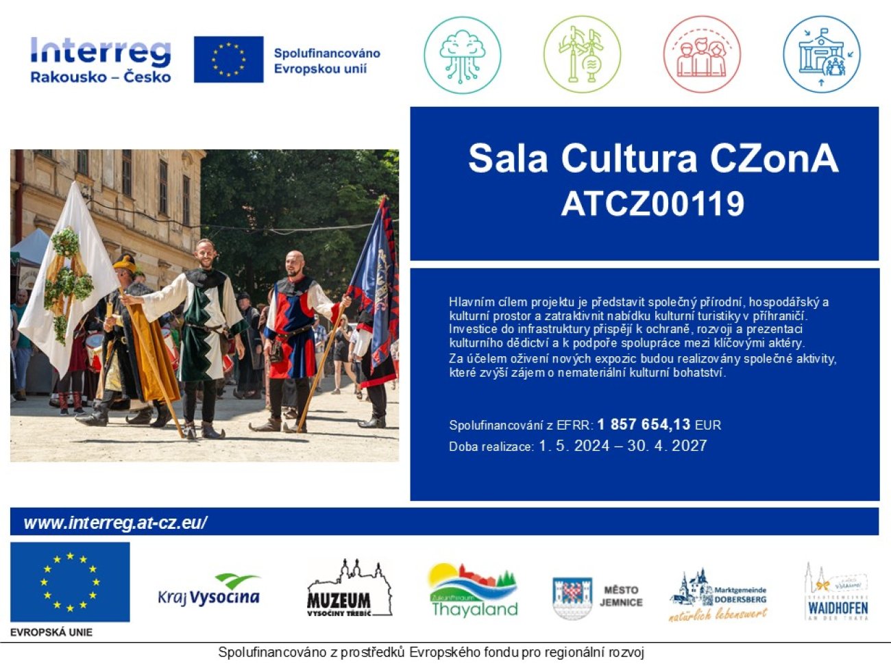 Projekt Sala Cultura CZonA (zkr. CZonA; registrační číslo ATCZ00119) je realizován v období 1. 5. 2024 – 30. 4. 2027 v rámci Programu Interreg Rakousko – Česko 2021-2027, a to v Prioritě 3 - Vzdělávání, kultura a cestovní ruch. Byl podpořen z Evropského fondu pro regionální rozvoj.