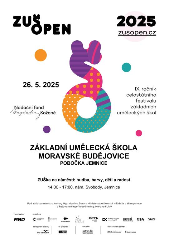 - 26.5. ZUŠka na náměstí: hudba, barvy, děti a radost, 14:00 - 17:00, nám. Svobody, Jemnice